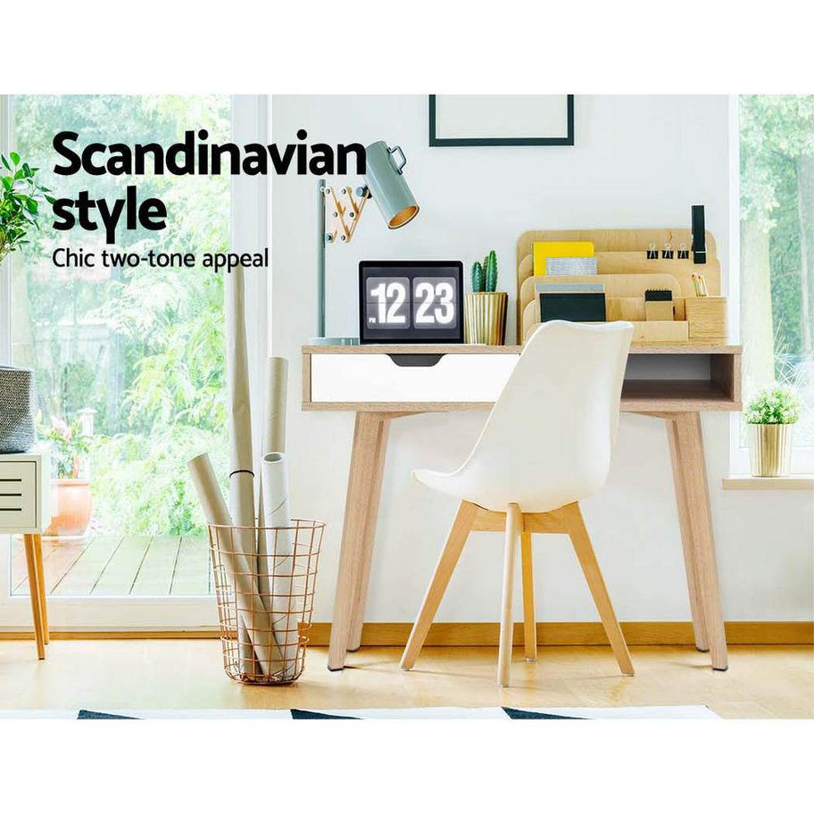 Inspired by the Scandinavian design ethos of utmost simplicity and maximum functionality, our Artiss Computer Desk is an outstanding realisation of this sought-after design ideology. With its contemporary two-tone hues, you will love the simple lines that bring out its minimalist inclinations. Displaying a solid wooden construction of durable 15mm thick particle board frame with smooth paper veneer finish, the computer desk features an anti-scratch base, a convenient single drawer with adjoining open storage and other sublime details that make this computer desk stand out. The iconic splayed rubber wood legs give the ensemble a nostalgic and yet modern disposition. Indulge in practical sophistication captured in fine style with our Nordic-influenced computer desk.